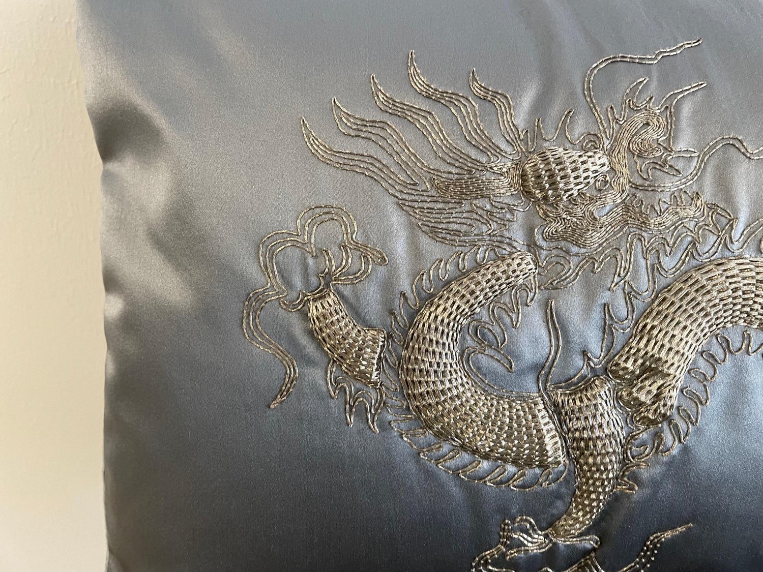 Black Silk Cushion Dragon Hand Embroidery Silver Thread Square Shaped For Sale At 1stdibs